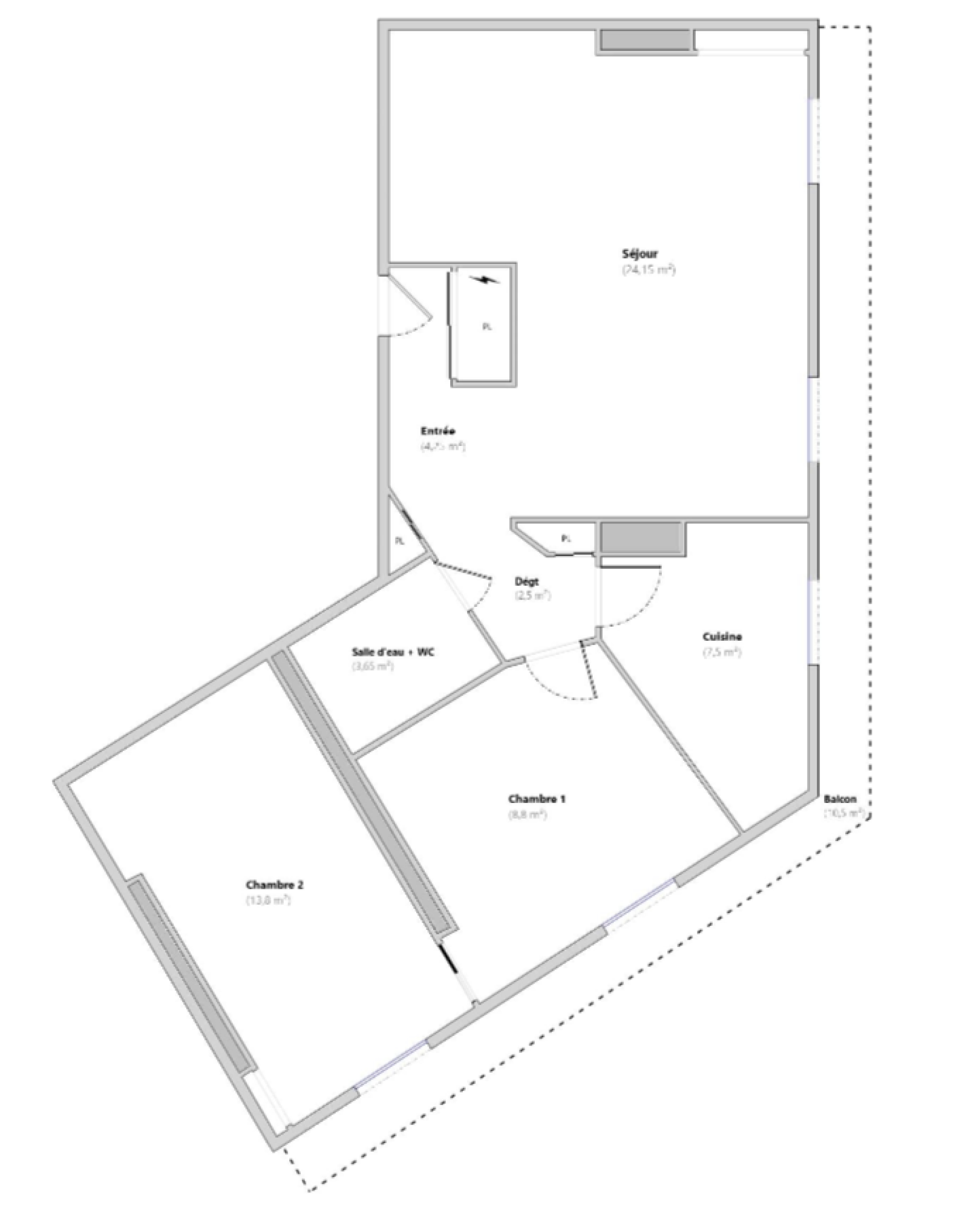 Le double séjour, la cuisine et les deux chambres donnent sur un balcon filant de 10m2, exposé Sud-Ouest.