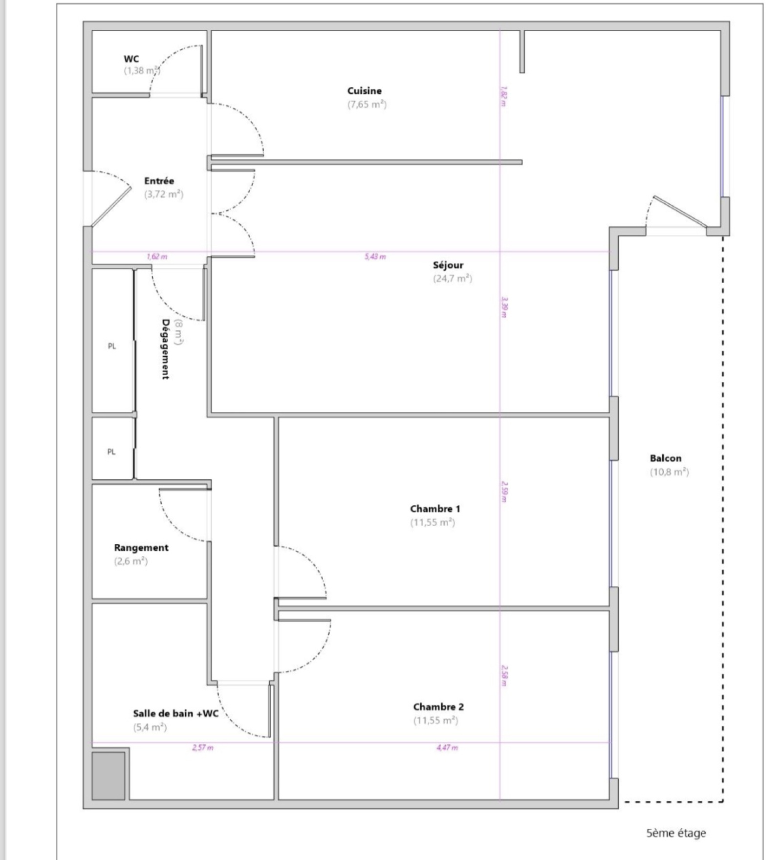Le bien est situé au 5ème étage avec ascenseur. Il se compose d'une entrée, d'un séjour de 25m2 donnant accès à une terrasse de 11m2 exposée plein Est, d'une cuisine ouverte de 8m2, de 2 chambres de 12m2, d'un dressing, d'une salle de bains avec WC et d'un WC indépendant.