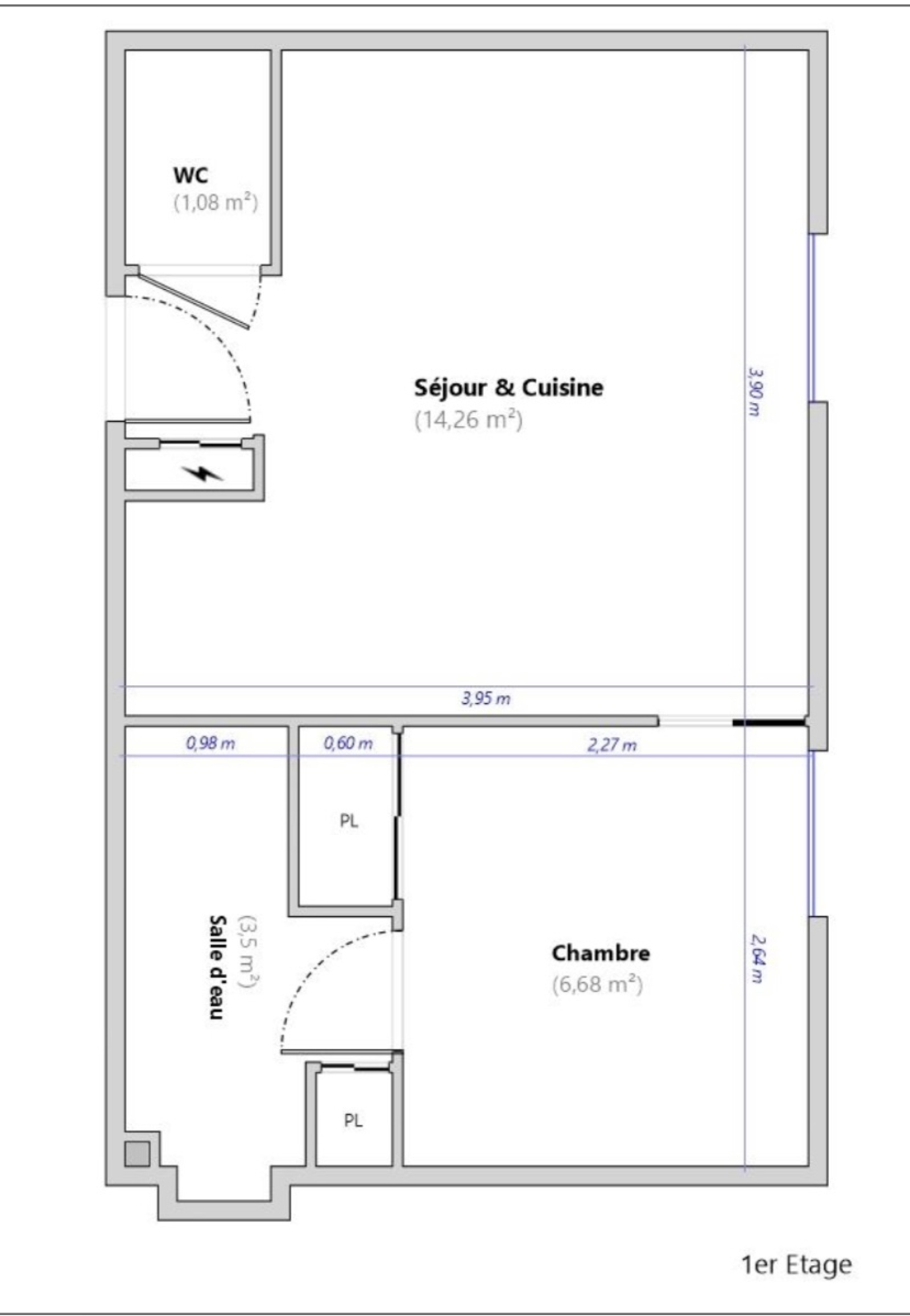 Ce bien, situé au 1er étage sans ascenseur d'un immeuble de 1850, se compose d'une cuisine ouverte sur le séjour, le tout pour une superficie de 14m2, d'une chambre de 7m2, d'une salle d'eau et d'un WC séparé.
