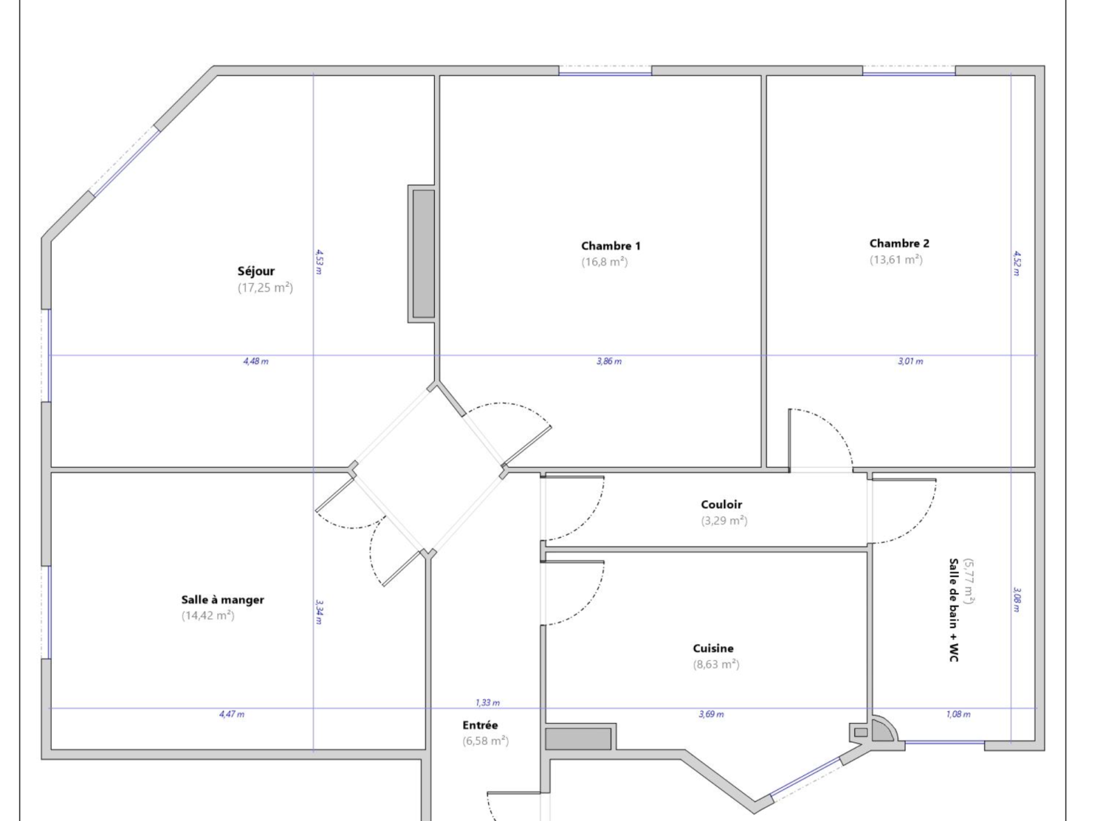L'appartement, calme et lumineux, est au 4ème étage avec ascenseur. Il se compose d'une entrée avec rangements, d'un séjour de 17m2 exposé Sud-Ouest, d'une salle à manger de 14m2 (possibilité d'ouvrir le mur entre les 2 pièces), d'une cuisine indépendante de 9m2, de 2 chambres de 17m2 et 14m2, d'une salle de bains avec WC et d'une cave.