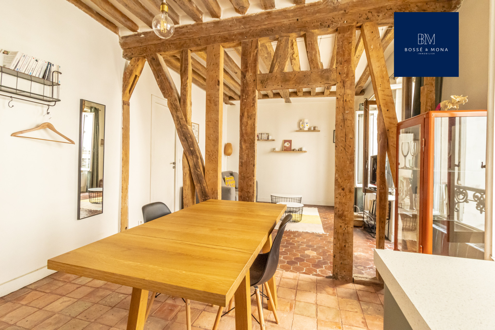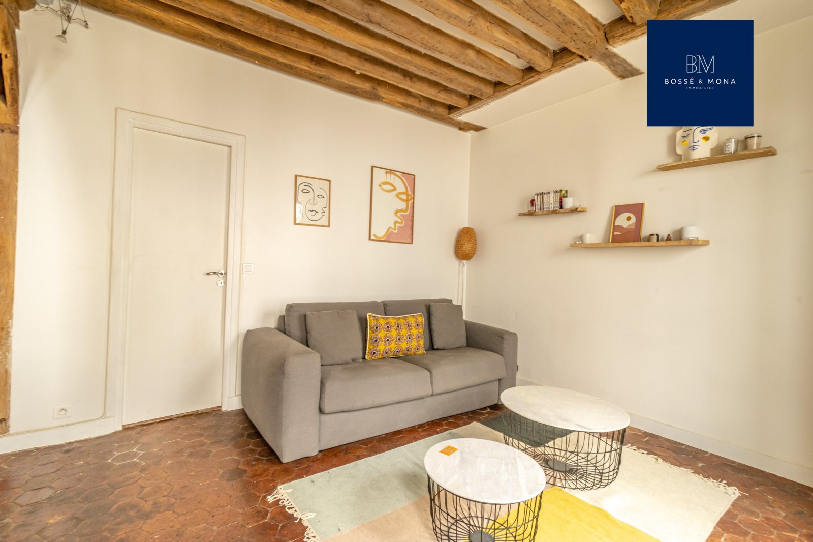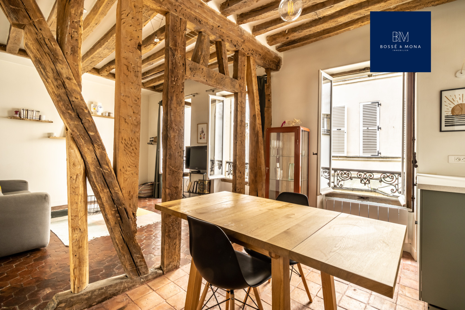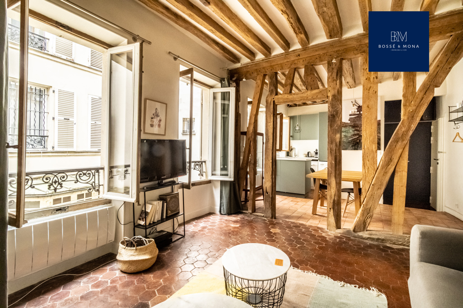 L'appartement, en parfait état et entièrement sur cour, est situé au 1er étage sans ascenseur d'un immeuble ancien. Il se compose d'une entrée avec rangements, d'un séjour de 25m2 exposé plein Sud avec cuisine ouverte entièrement équipée et aménagée, d'une chambre avec rangements, d'une salle d'eau et d'un WC indépendant. Le bien dispose de tomettes et de poutres apparentes.