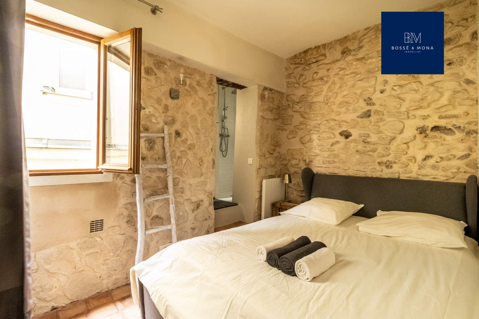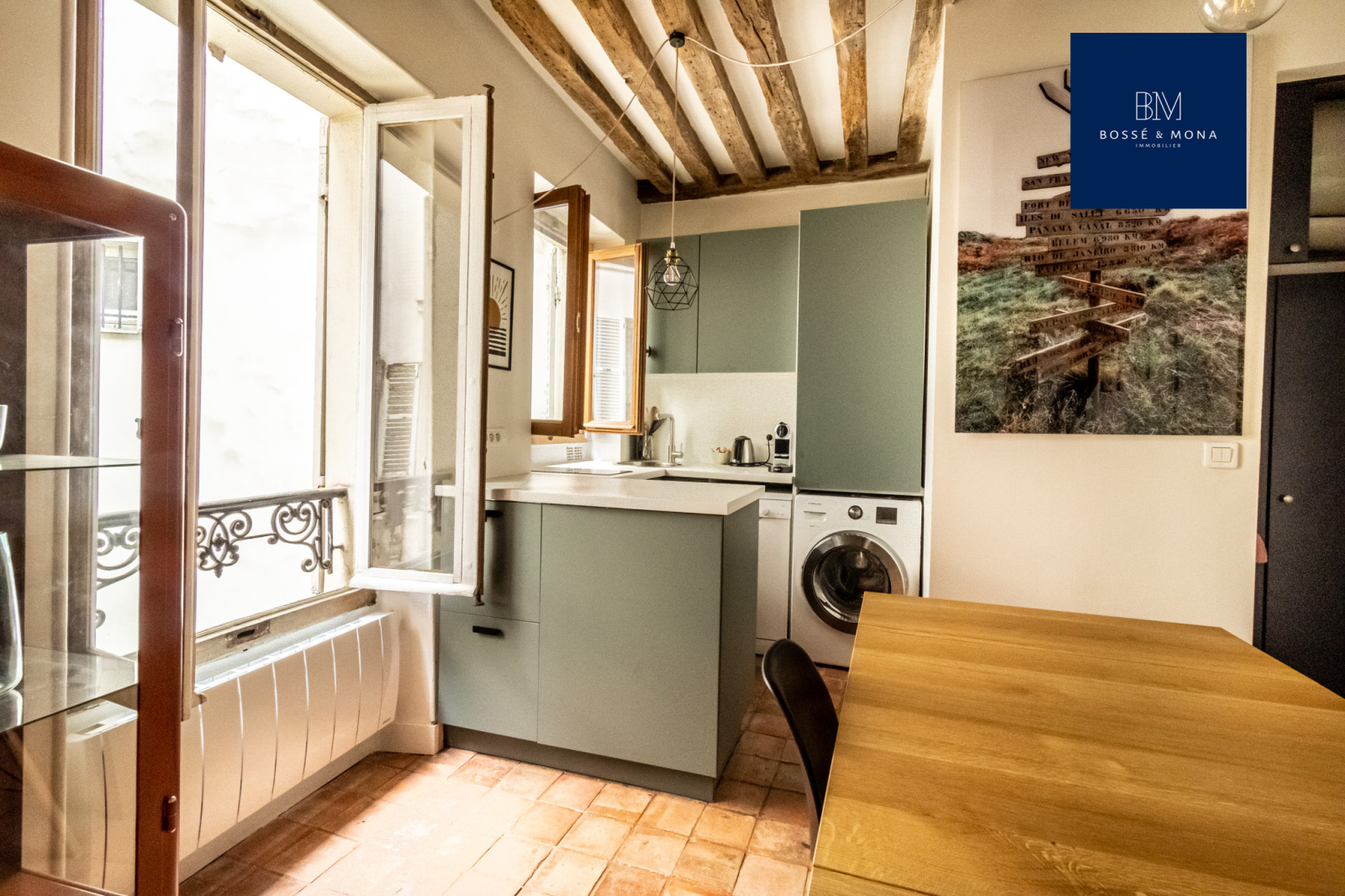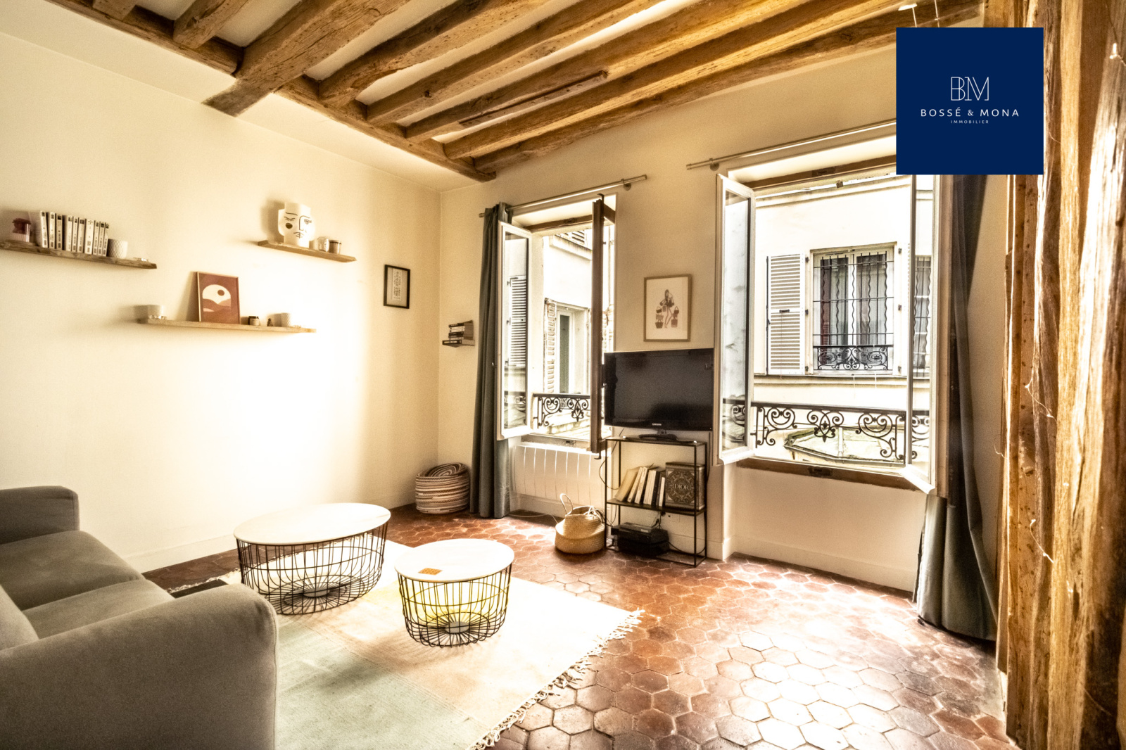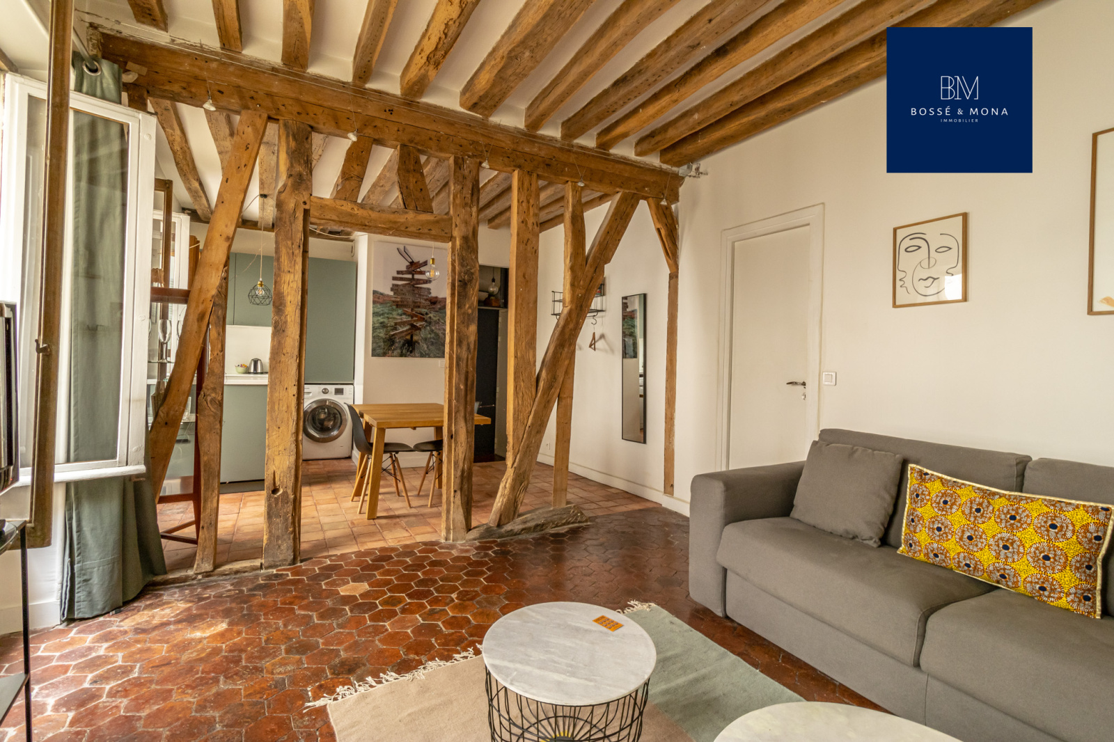 L'appartement, en parfait état et entièrement sur cour, est situé au 1er étage sans ascenseur d'un immeuble ancien. Il se compose d'une entrée avec rangements, d'un séjour de 25m2 exposé plein Sud avec cuisine ouverte entièrement équipée et aménagée, d'une chambre avec rangements, d'une salle d'eau et d'un WC indépendant. Le bien dispose de tomettes et de poutres apparentes.