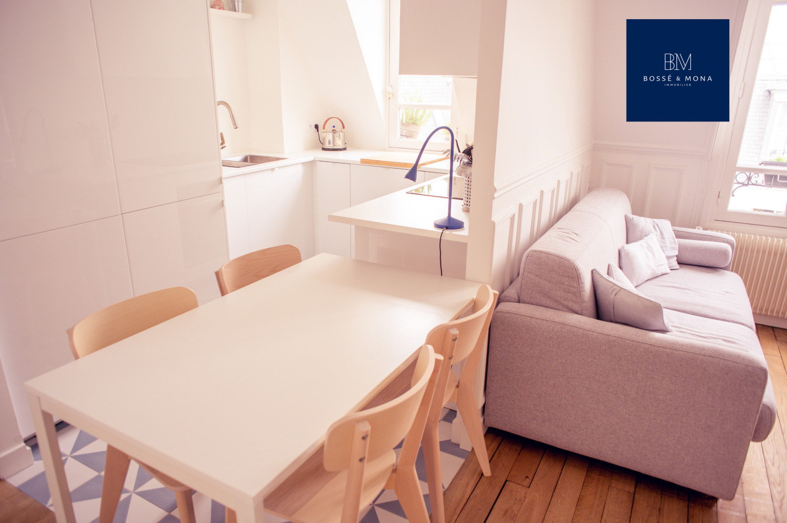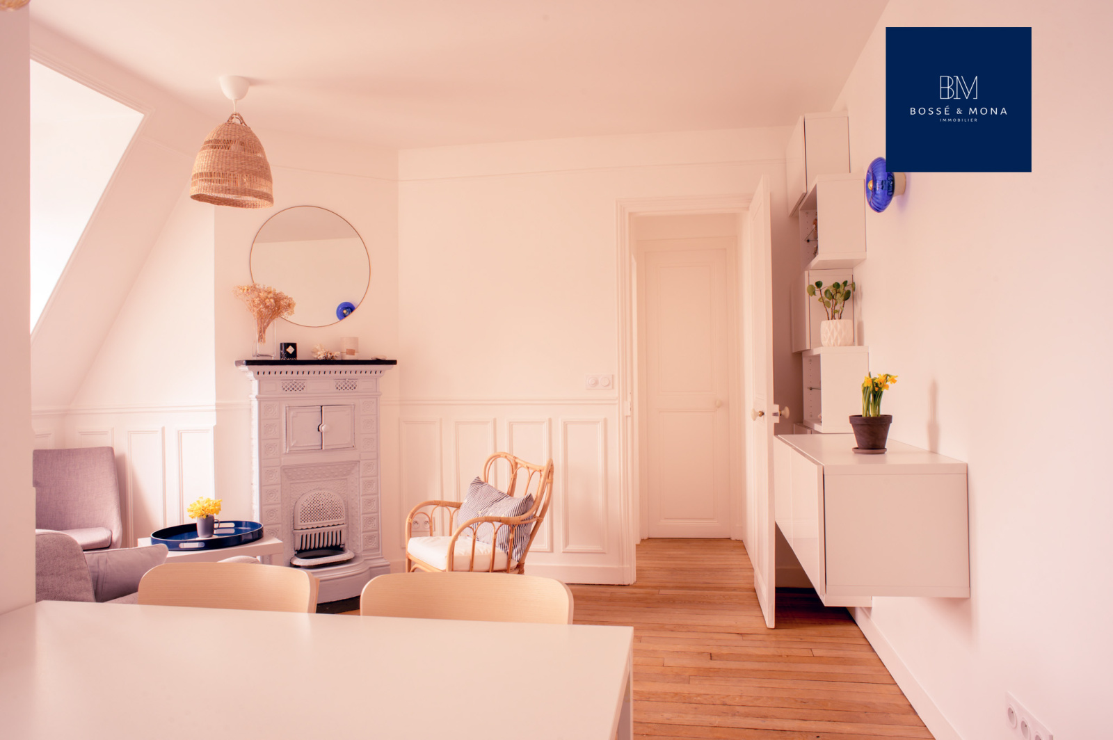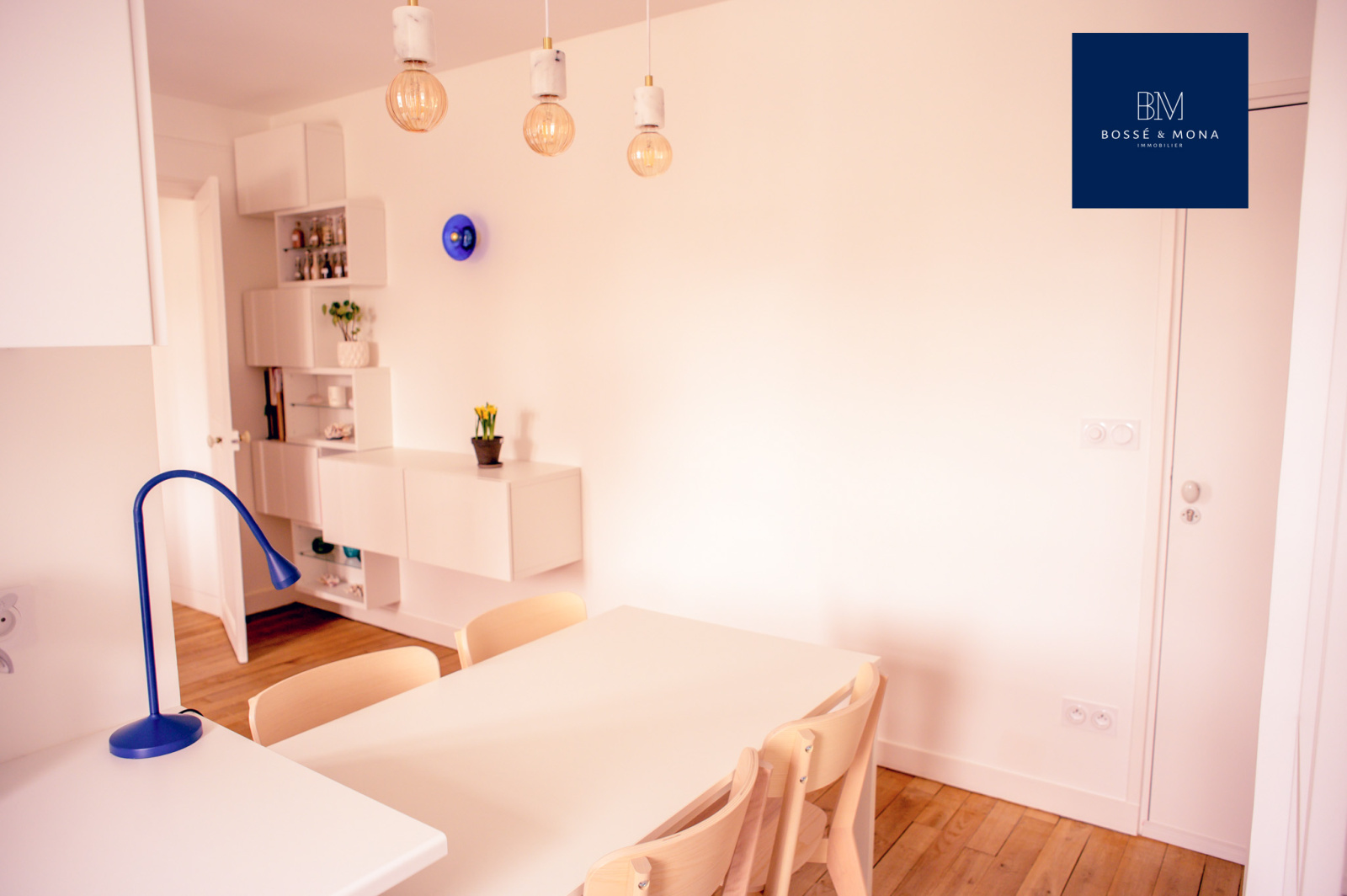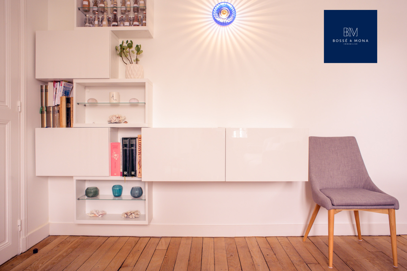 Refait à neuf par architecte en 2020, il est composé d’une cuisine entièrement équipée avec électroménager de qualité, semi-ouverte sur un séjour lumineux (21m2), d’une chambre (lit 160x200) avec salle de douche attenante avec fenêtre, d’un wc indépendant avec fenêtre. Espace optimisé par de nombreux rangements intégrés (placards, penderies et bibliothèque sur mesure) préservant le charme de l’haussmannien (hauteur sous plafond, moulures, poêle prussien, parquet plein chêne).