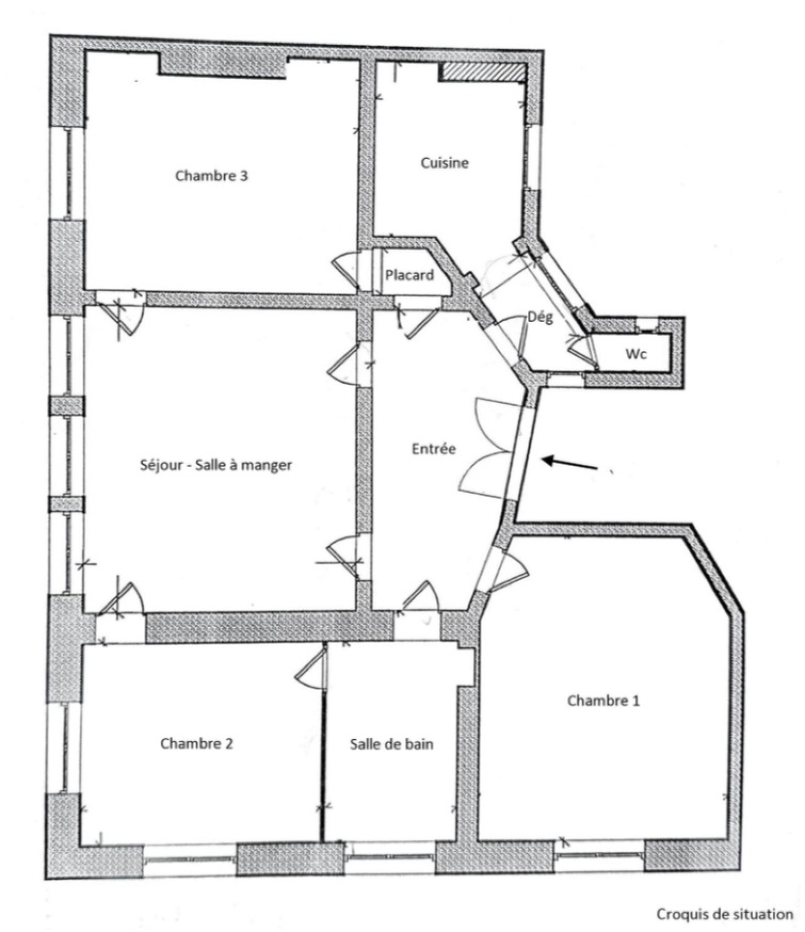 Le bien, unique appartement du palier, à rénover, est situé au 4ème étage sans ascenseur d'un immeuble classé de 1846, de style Louis-Philippe. Il se compose d'une entrée, d'un séjour de 20m2, d'une cuisine indépendante, de trois chambres de 11m2, 14m2 et 19m2, d'une salle de bains et d'un WC séparé.