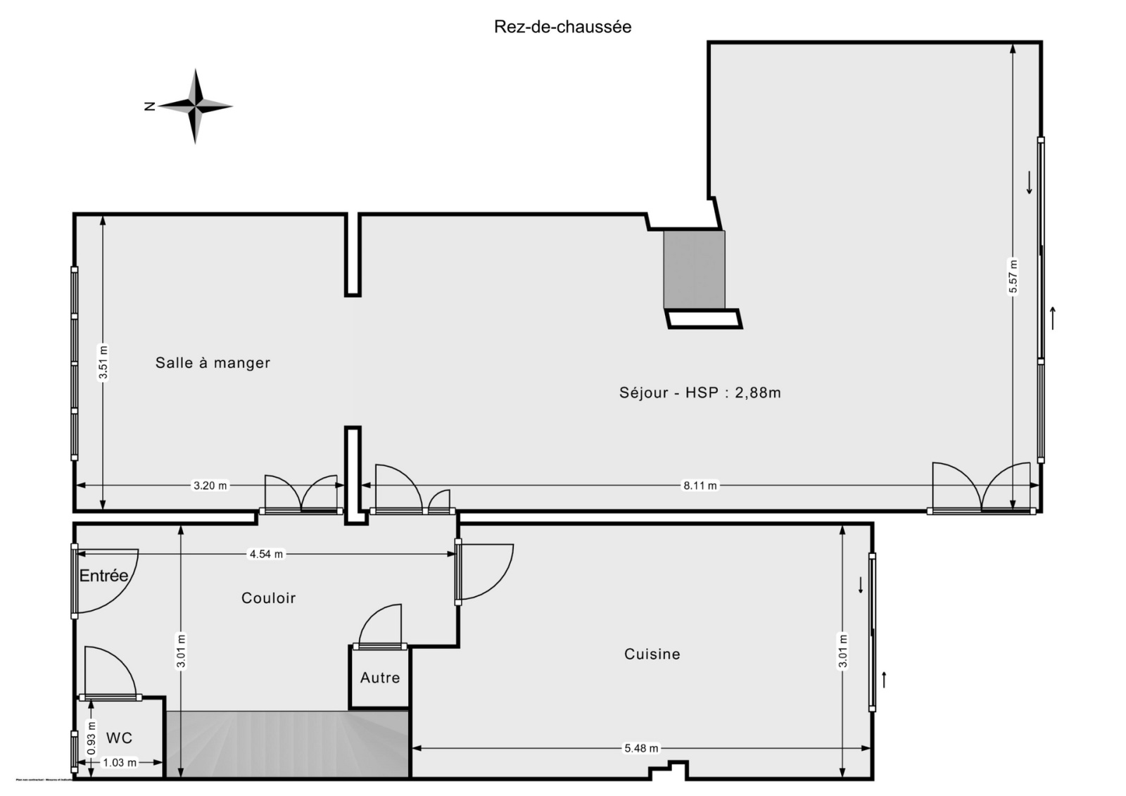 - Au rez-de-chausée: d'une entrée, d'un espace salon / salle à manger de 50m2, traversant, donnant accès à une terrasse et un jardin de 500m2, d'une cuisine indépendante de 15m2, et d'un WC indépendant.
