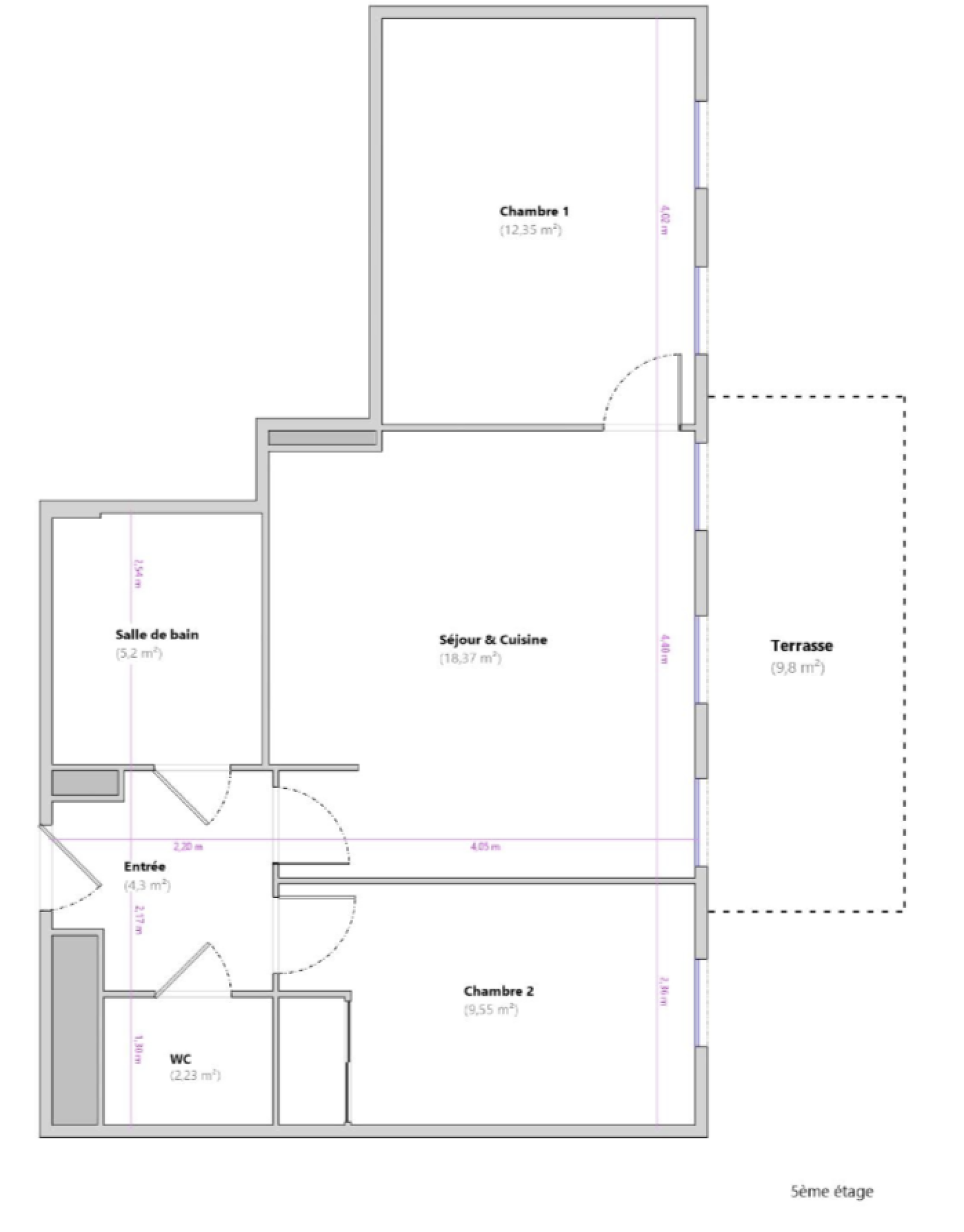 Il se compose d'une entrée, d'une cuisine ouverte sur le séjour de 18m2 donnant sur une terrasse de 10m2 exposée Nord-Est, de 2 chambres de 12m2 et 9.5m2, d'une salle de bain et d'un WC indépendant.