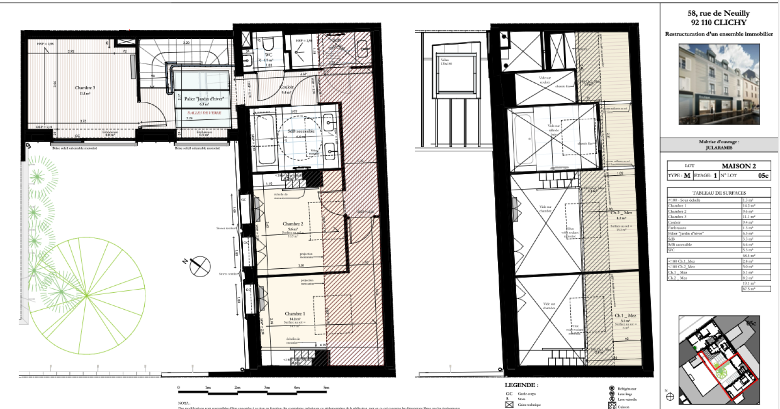 -Au 1er étage : de 3 chambres de 14m2, 11m2 et 10m2, de 2 chambres avec mezzanine de 9m2 chacune, de 2 salles de bains et d'un WC.